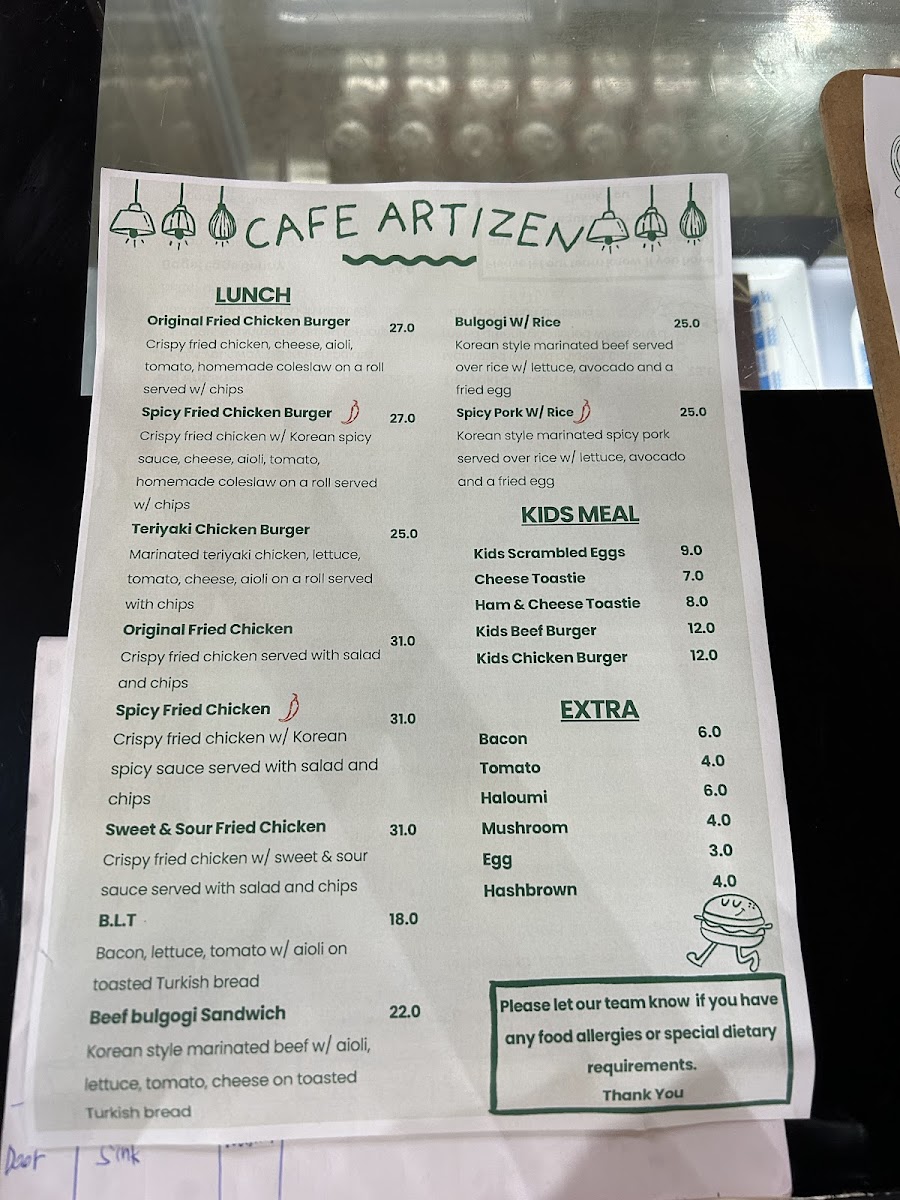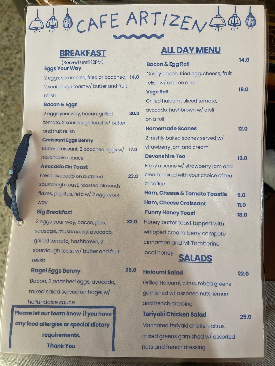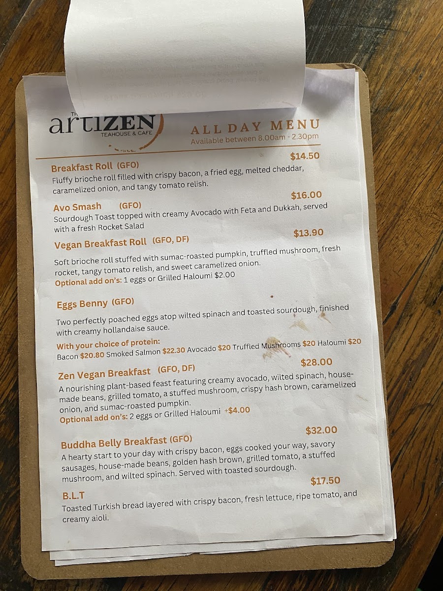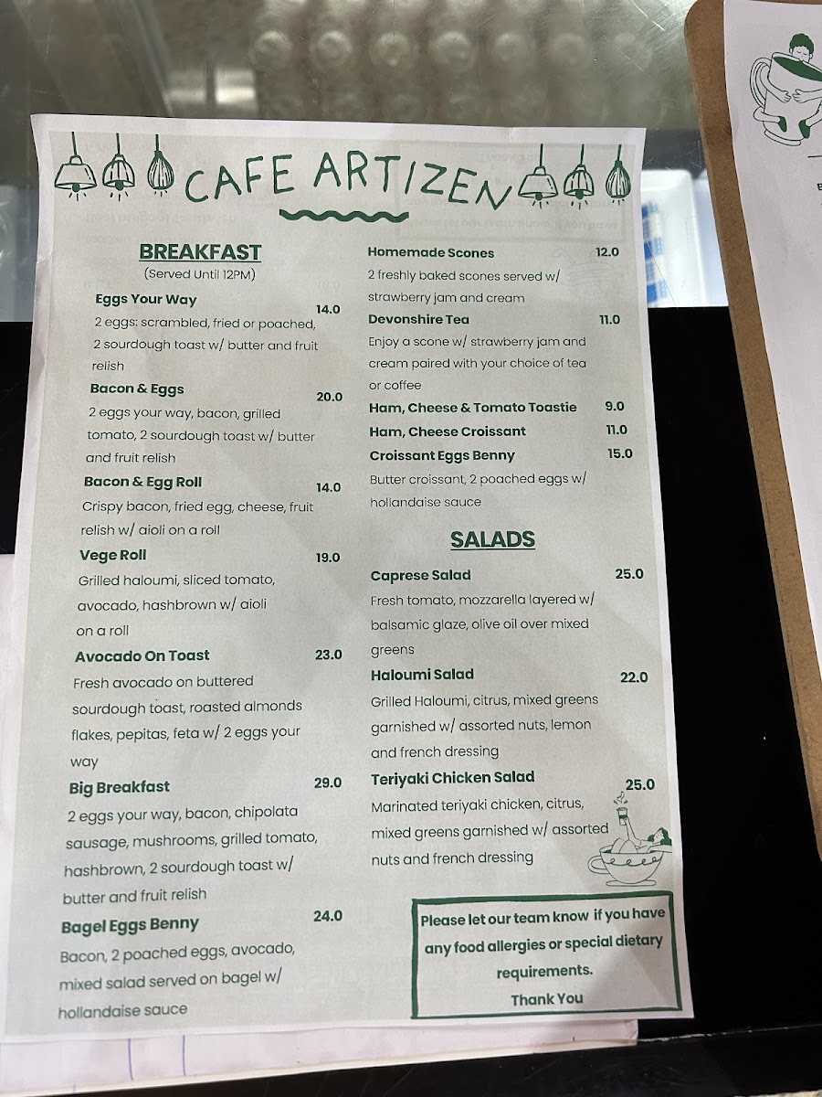 The menu at Artizen Cafe features a selection of dishes suited for breakfast and lunch, alongside a variety of sides. The breakfast offerings are available all day and include options such as sourdough and raisin toast with assorted condiments, as well as more composed dishes like eggs served with whipped feta and beetroot relish. Lunch selections focus on sandwiches, including classic and vegetarian club sandwiches with different protein and vegetable fillings, as well as a B.L.T on Turkish bread.